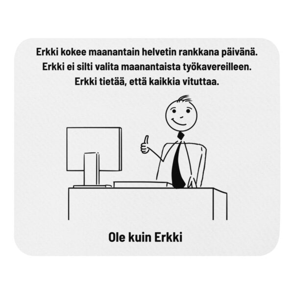 Olitpa tekemässä töitä, selaamassa nettiä tai selviytymässä maanantaista, tämä Ole kuin Erkki -hiirimatto pitää hiiren liikkeet hallinnassa ja suun supussa. Erkki tietää, että maanantai vituttaa. Siksi hän ei valita siitä työkavereille – kaikkia vituttaa jo valmiiksi. Laadukas pinta takaa sulavan ja tarkan käytön ja pitävä pohja pysyy paikoillaan, vaikka viikko alkaisi väärällä jalalla ja kahvi olisi laihaa. Laita hiiri matolle, huokaise kerran ja tee tarvittava – Erkki hoitaa maanantain ilman draamaa.